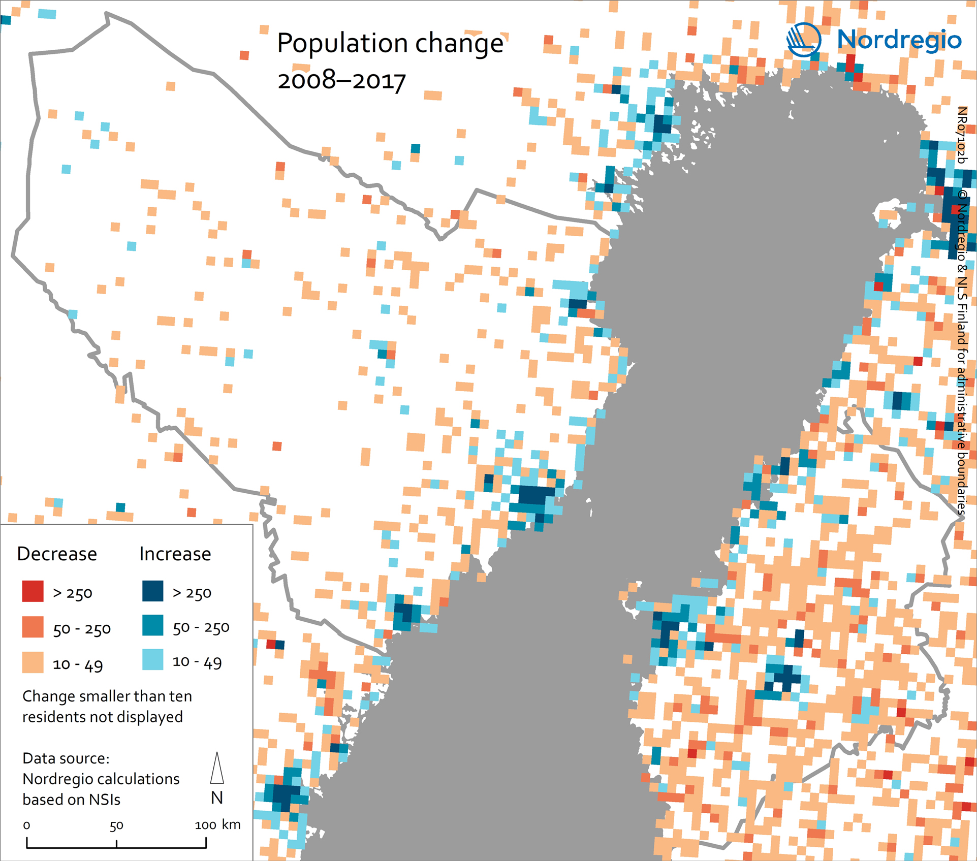Figure 2. Population change in the Kvarken region at the grid level (5,000 × 5,000 m).