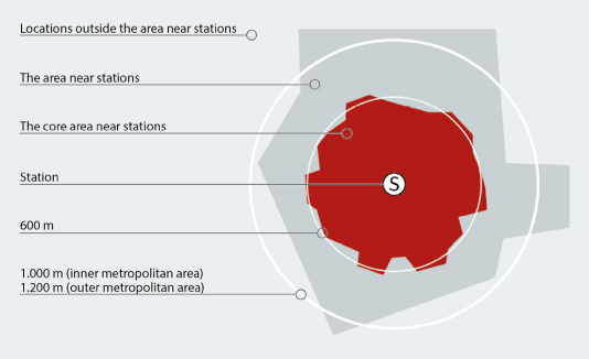 On the Danish side of the GCR, the Fingerplan guides urban development for the Capital Region of Denmark and for parts of Region Zealand. Published for the first time in 1947, the Fingerplan stresses, among other things, the principle of having workplaces located near stations as a way to promote the use of public transport. The planning directives of the Fingerplan vary in terms of accommodating different settings within its area – for instance, different distances from the station (Figure 1). Urban developments of a regional nature are in the core area, and urban developments of a local nature are in the most peripheral areas (Ministry of the Environment, 2015).