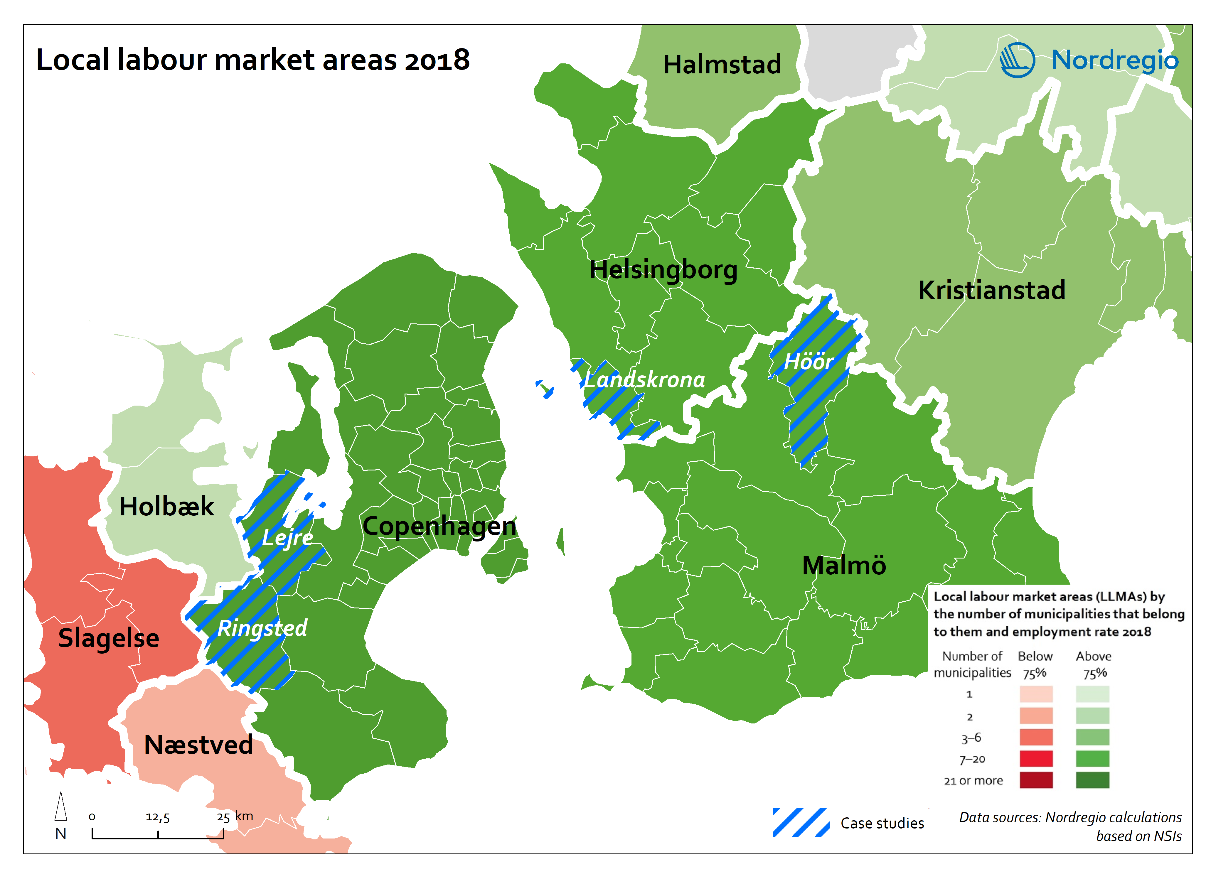 The inputs in this case study analysis rely mostly on qualitative interviews and discussions with municipal and city planners in four municipalities within the Greater Copenhagen Region. Two cases, representing one small and one medium-sized city, were selected on each side of the Öresund strait: Höör and Landskrona in Sweden, and Lejre and Ringsted in Denmark. They are in different labour market areas located within one hour of either Copenhagen or Malmö, all having at least 75% of their workforce employed (Map 3).