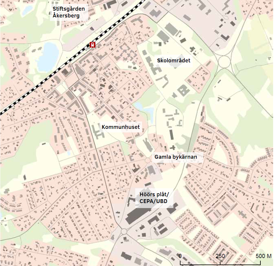 Figure 2 illustrates the location of Höör train station in its direct surroundings (Figure 2). The train station is located north-west of the city centre, while most of the built environment is concentrated south-east of the train station. The majority of urban settlement is also south of the train station, with the city centre within walking distance – although visually disconnected from the station. North and north-west of the train station, there are a number of single-family homes, but also relatively large portions of undeveloped land, which are also in direct proximity to the north-western parts of the train station. That specific area north-west of the train station has in fact been undergoing planning over the past decade; and even more intensively in recent years, when the planning process for a detailed development plan was taking shape.