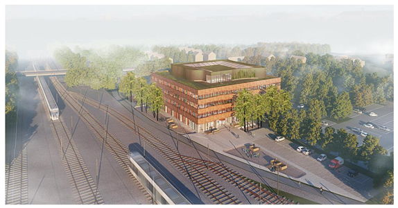 With the Copenhagen-Ringsted line in full operation, the station area has consequently been, and continues to be, an important part of the municipality as it is planned – and onto which transit-oriented development trends are being projected and realised. In a 2013 report surveying the development potential of the station area, it was observed that, "One of the most lucrative areas for the construction of larger office space is the area around Ringsted Station." (Ringsted Kommune, 2013). This development follows the upgrade of the railway track area, which started in December 2016. In total, 75% of the station's tracks, switches and platforms will be rebuilt. It is therefore the largest station rebuild in Denmark, according to Banedanmark. One concrete example of development within the station area vicinity has been the newly built offices for Banedanmark, the state-owned railway network company (Figure 11). The building, which is 8,200 m2, will accommodate about 360 employees and is located within walking distance of the station.