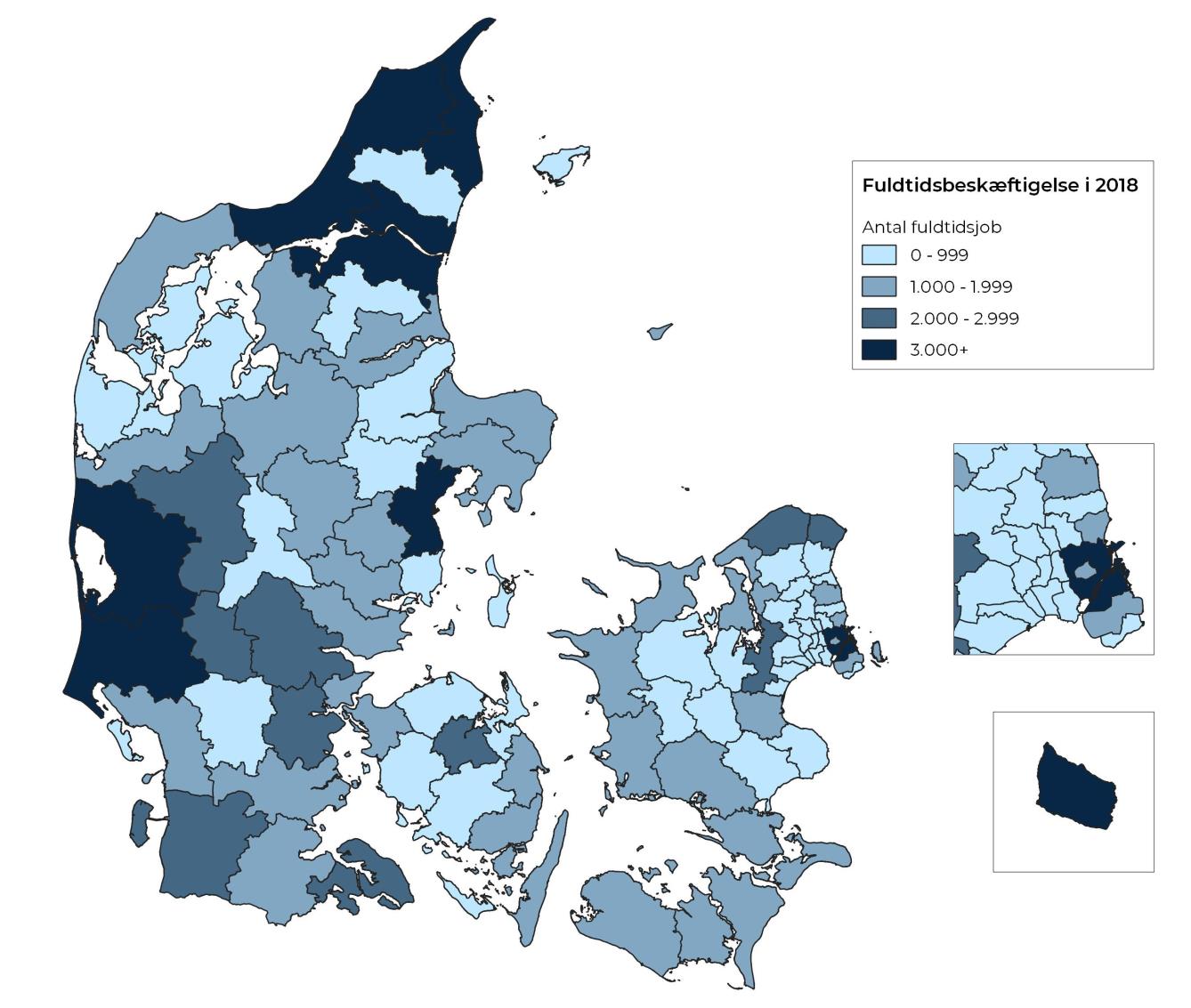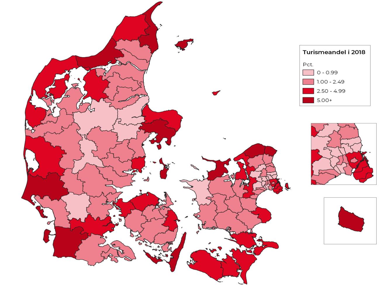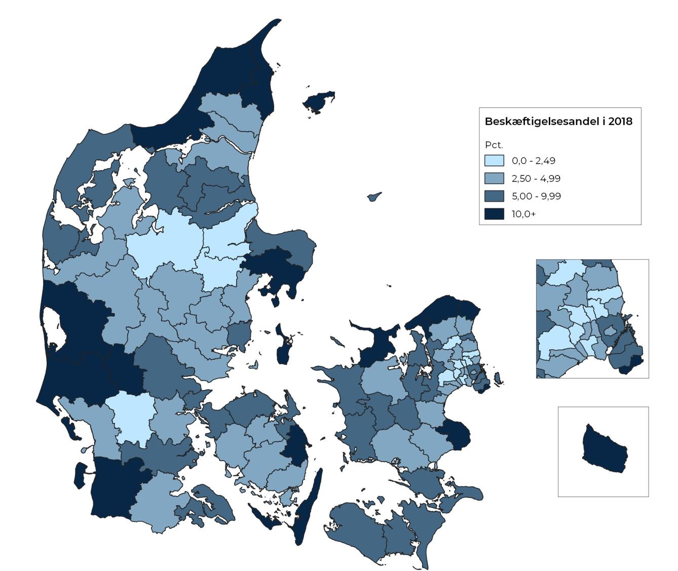 According to the latest RTSA figures, the average job generation effect in Denmark was 1,700 full-time jobs per municipality, with great variation between municipalities (see Maps 4 and 5). This is calculated as total employment from tourism including direct, indirect and induced effects (VisitDenmark, 2019). As the maps above and TSA results show, a large share of tourism accumulates in a small number of municipalities. The 10 largest municipalities received 48% of tourism consumption. Århus and the Capital region are the largest recipients of tourism income, but coastal municipalities such as Varde, Ringkøbing-Skjern, Frederikshavn, Jammerbugt, Bornholm and Hjørring accounted for 32.8% of tourism consumption in 2018.
