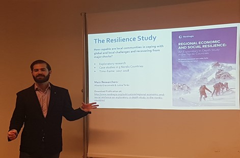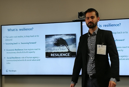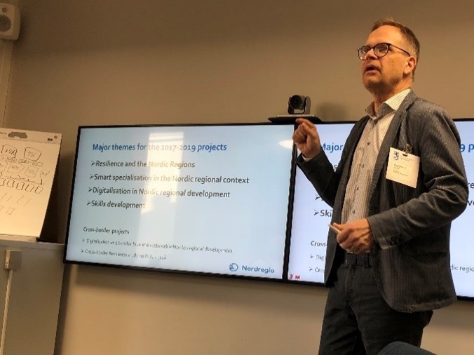 Building regional resilience is vital in an interconnected global economy. Resilience thinking gives regions the possibility to anticipate and respond to unexpected events. Jukka Teräs, Senior Research Fellow at Nordregio and co-ordinator of the Nordic thematic group on Innovative and Resilient Regions 2017–2020, opened the concept of economic and social resilience with concrete examples of resilience approaches in Nordic regions.