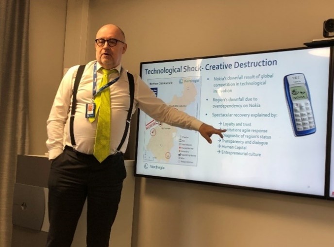 The presentation was targeted to a group of innovation and regional development experts within the Ministry of Economic Affairs and Employment, working with innovation issues. The group, hosted by Mikko Huuskonen, the chair of TG2 in 2017–2018, appreciated the presentation and findings of the Nordic resilience study and raised several interesting questions. The discussion included e.g. the difference between acute shocks and so-called ‘slow burn’ that regions and cities may face.