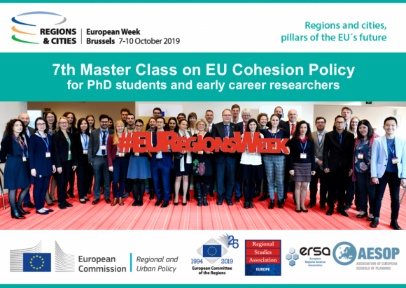 The 7th masterclass on EU cohesion policy with some 30 PhD and early career students was held on October 6–11, 2019 in Brussels as part of the 17th European week for regions and cities organised and led by the European Commission, DG for Regional and Urban Policy (DG REGIO), the European Committee of the Regions (CoR), and the Regional Studies Association European Foundation (RSA Europe) in co-operation with the European Regional Science Association (ERSA) and the Association of European Schools of Planning (AESOP).