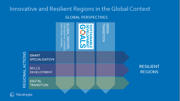 The presentation opened up the concept of skills, referring to literature and policy. Subsequently, different policy approaches and regional examples from across the Nordic countries were addressed based on the empirical evidence analysed within the TG2 projects. In addition, the role of digitalisation in strengthening resilient societies was brought up, based on the study on ‘Rural perspectives on digital innovation: Experiences from small enterprises in the Nordic countries and Latvia’. Finally, skills development and the digital transition were discussed in a broader regional development context showing how they can be an integrative part of regional strategies to secure resilience and redirect economies into more sustainable development paths (see figure below).