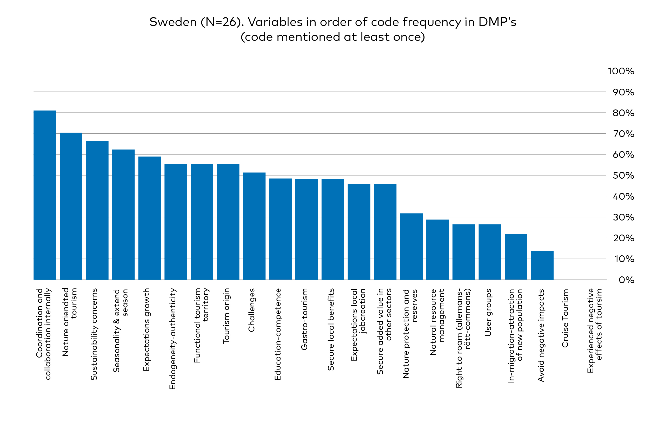 In Åland’s tourism strategy, ‘challenges’ are discussed along with the variables that were named ‘functional tourism regions’, ‘cruise tourism’, ‘endogeneity/authenticity’, ‘secure local benefits’ and ‘sustainability concerns’. Each of these cover between 2.9% and 2.3%. It should also be noted that the tourism strategy of Åland dates from 2012, and since then it has been briefly updated, with references to a separate ‘sustainability strategy’. The least-mentioned variables, according to the proportional coding statistics, were then ‘in-migration and attraction of new population’, ‘nature protection and reserves’ and ‘tourist origin’. However, the variables concerning ‘the right to roam’, ‘natural resource management’, ‘avoid negative impacts’ and ‘experienced negative effect of tourism’ was not coded for in the Åland tourism strategy.